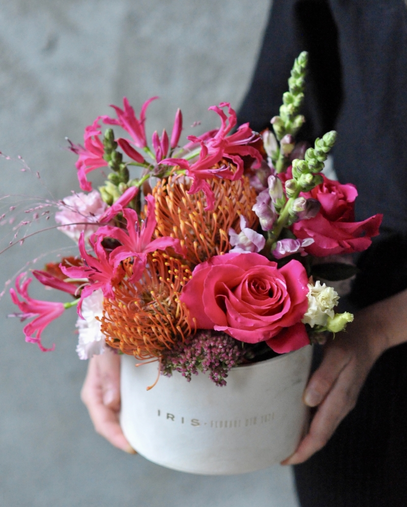 Acest produs conține; 3 trandafiri cyclam, 3 antirrhinum lavender, 1 sedum, 2 leucospermum, 1 lisianthus roz, 1 panicum roz, 2 nerine cyclam, 1 quercus lila, cutie M2 si alte materiale.