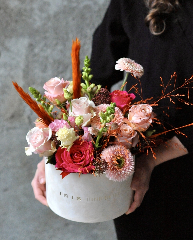 Acest produs conține: 3 trandafiri roz, 2 trandafiri cyclam, 4 trandafiri peach, 4 gerbera roz, 2 lisianthus roz, 1 quercus maro, 2 pampas portocaliu, 2 panicum portocaliu, 1/2 skimmia, cutie M3 si alte materiale.