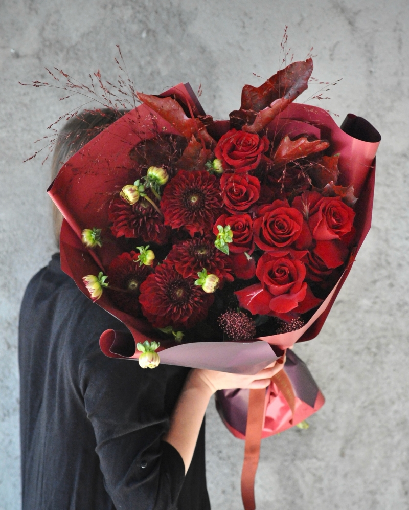 Acest produs contine: 9 trandafiri rosii, 6 dahlii grena, 1/4 skimmia, 3 panicum grena, 2 quercus maro, 5 coli, funda Iris si alte materiale.